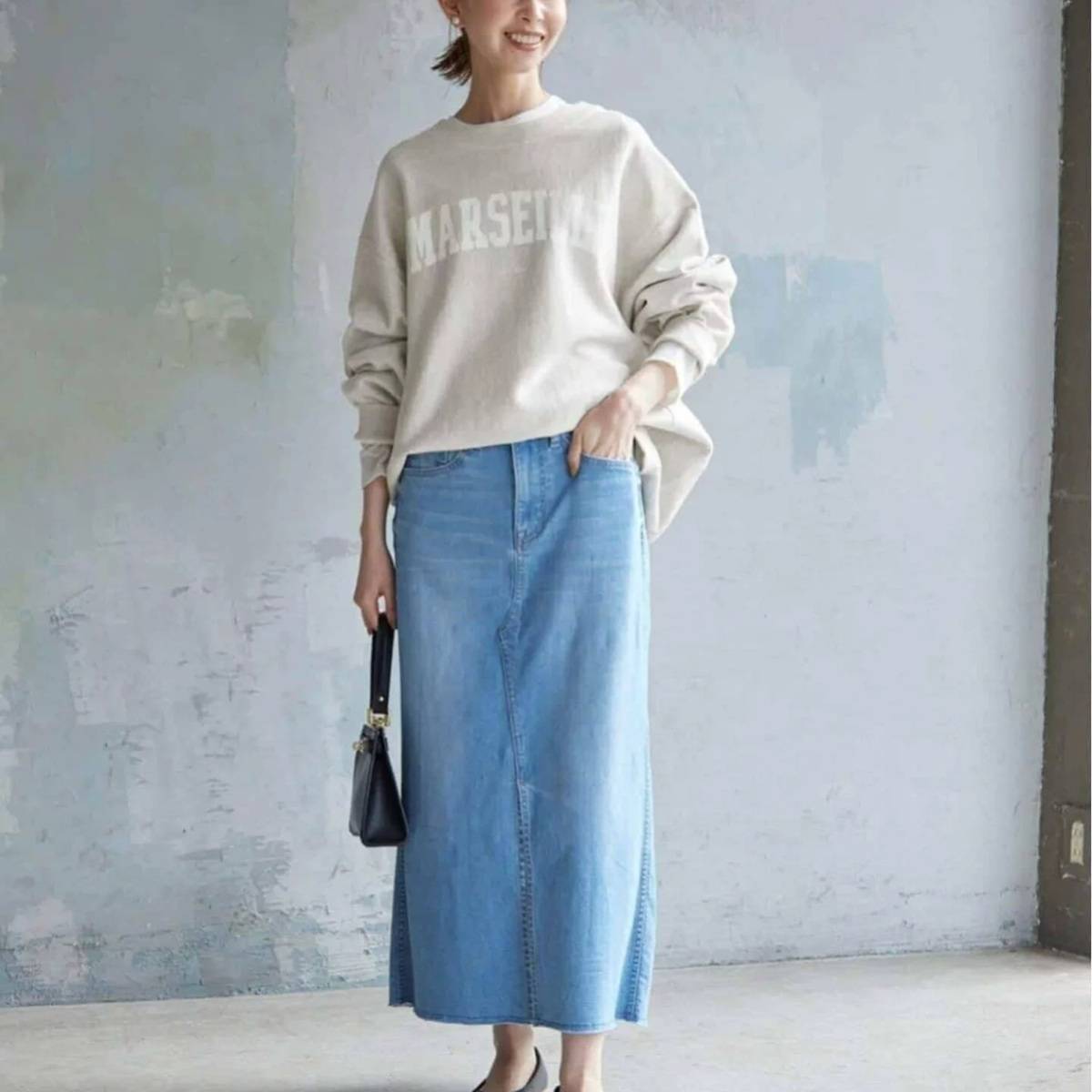 明るめカラーのデニムスカートで、季節感のある爽やかなスタイルに仕上がります。