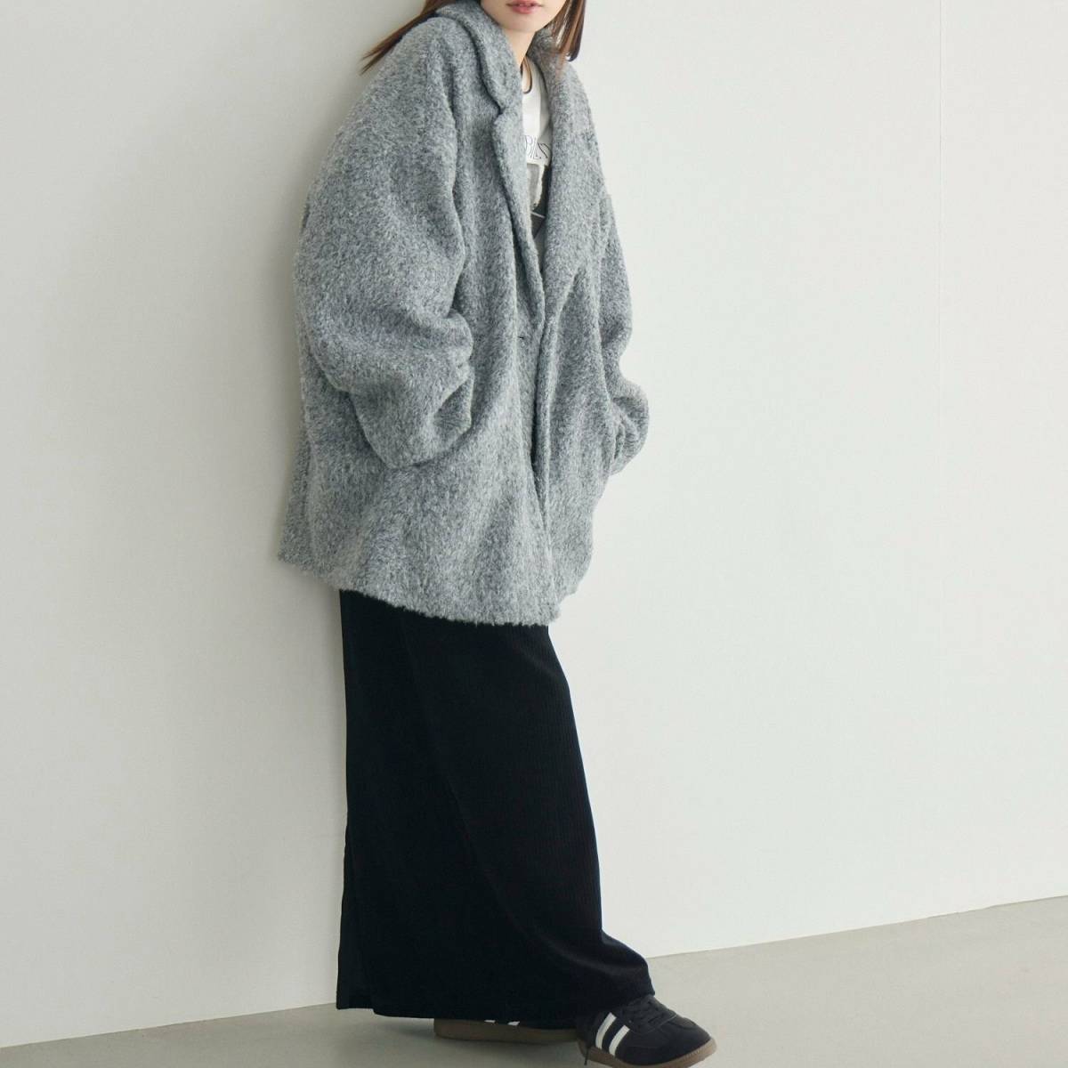ボリュームのあるボアコートを主役にした、大人カジュアルコーデ。