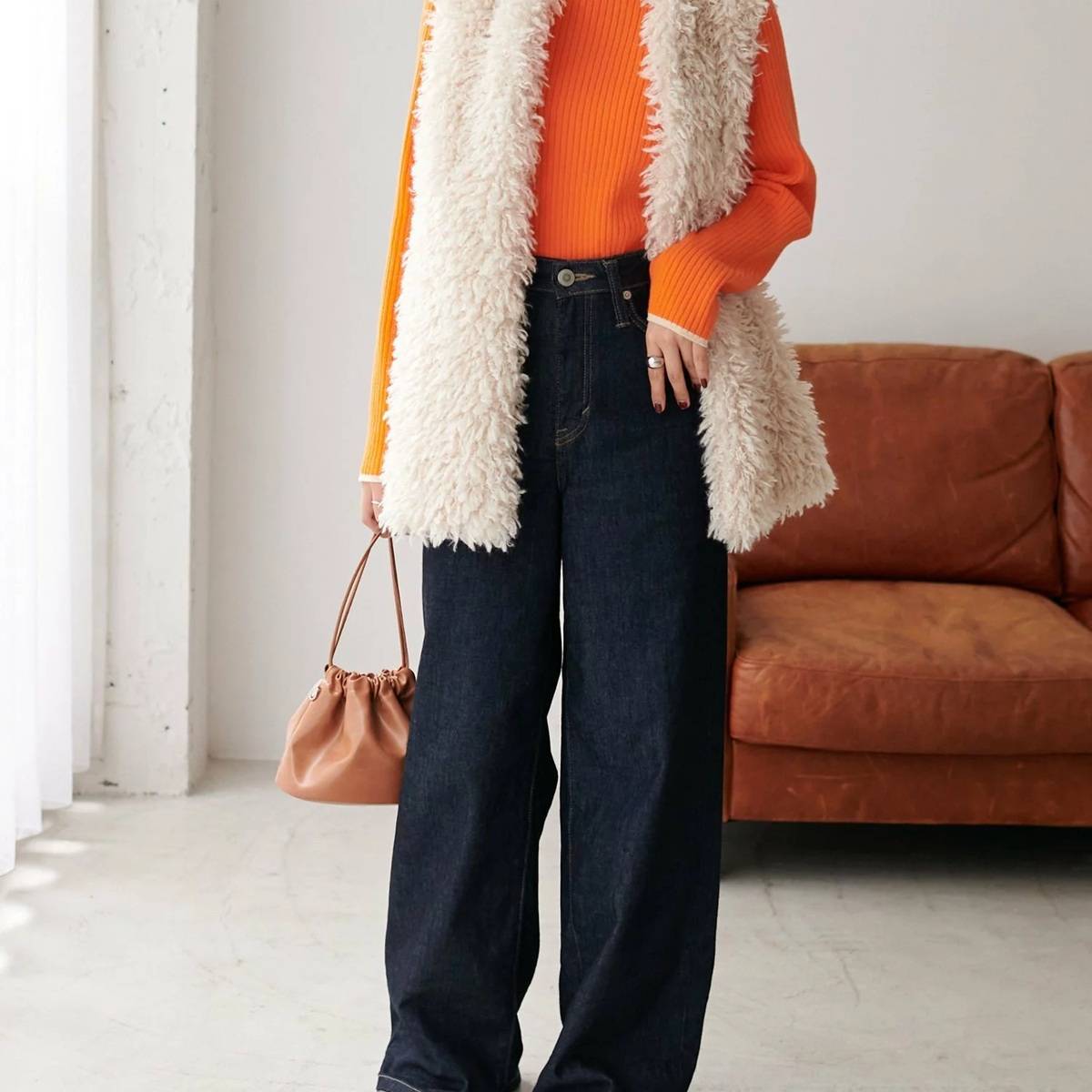 オレンジのニットに深みのあるダークカラーのデニムが相性抜群。