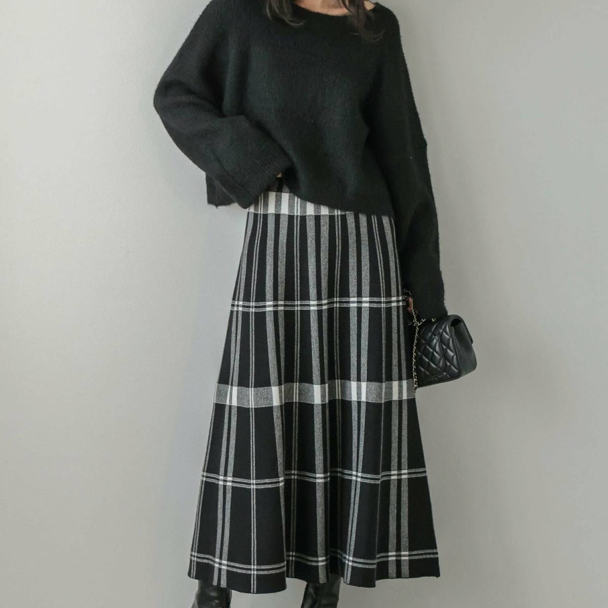 デザイン性の高いチェックスカートには、トップスや小物類をブラックでまとめた着こなしがおすすめです。