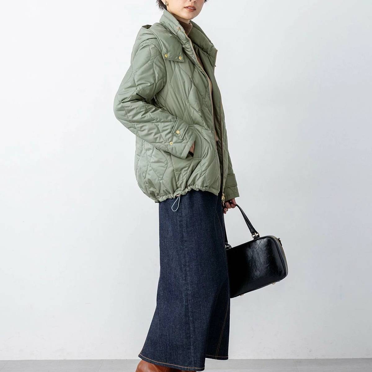 トップスやアウターをコンパクトにまとめると、バランスのいい着こなしに。