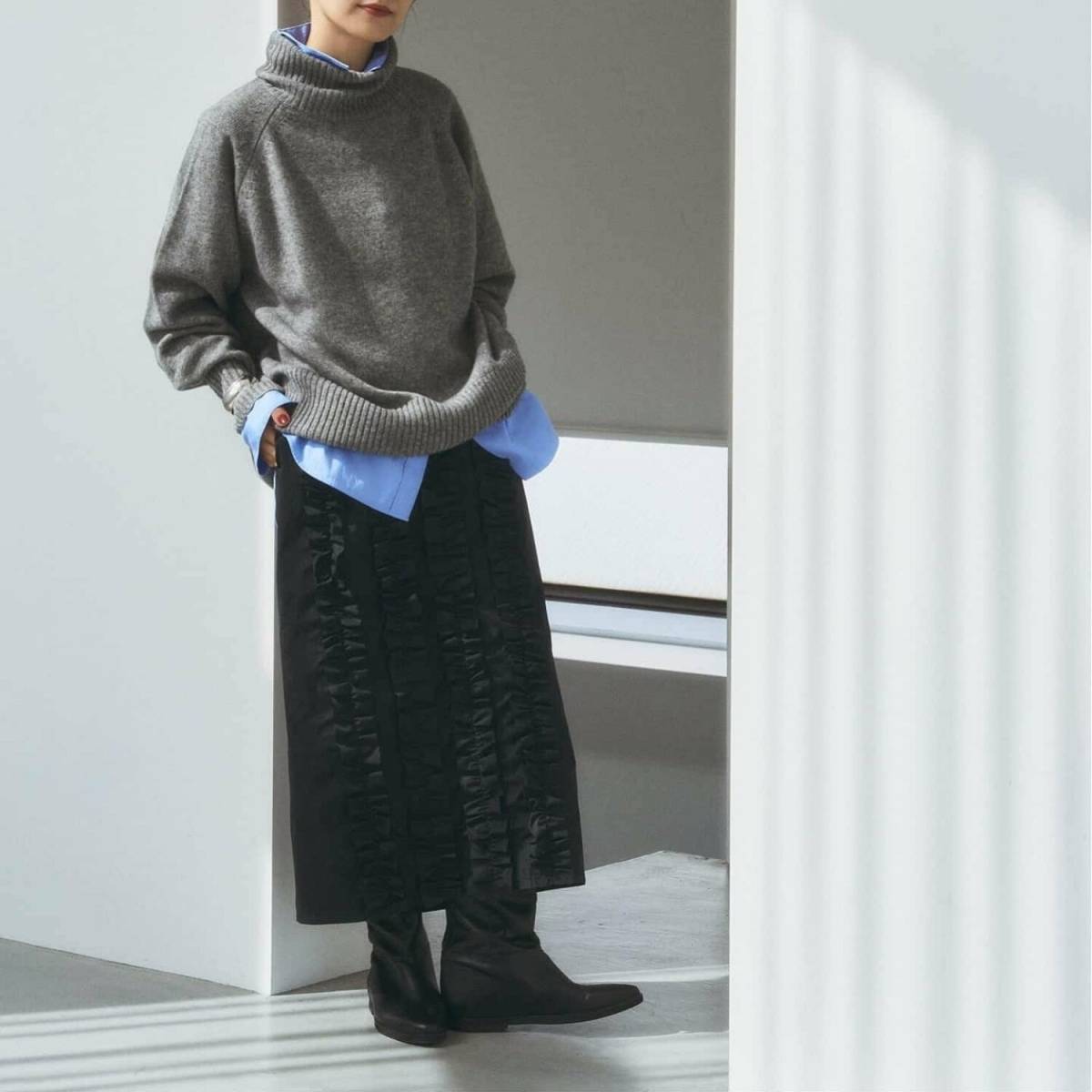 タフタ素材の黒タイトスカートが主役の冬コーデ。表面感のあるスカートが、ワンランク上のおしゃれスタイルを叶えます。