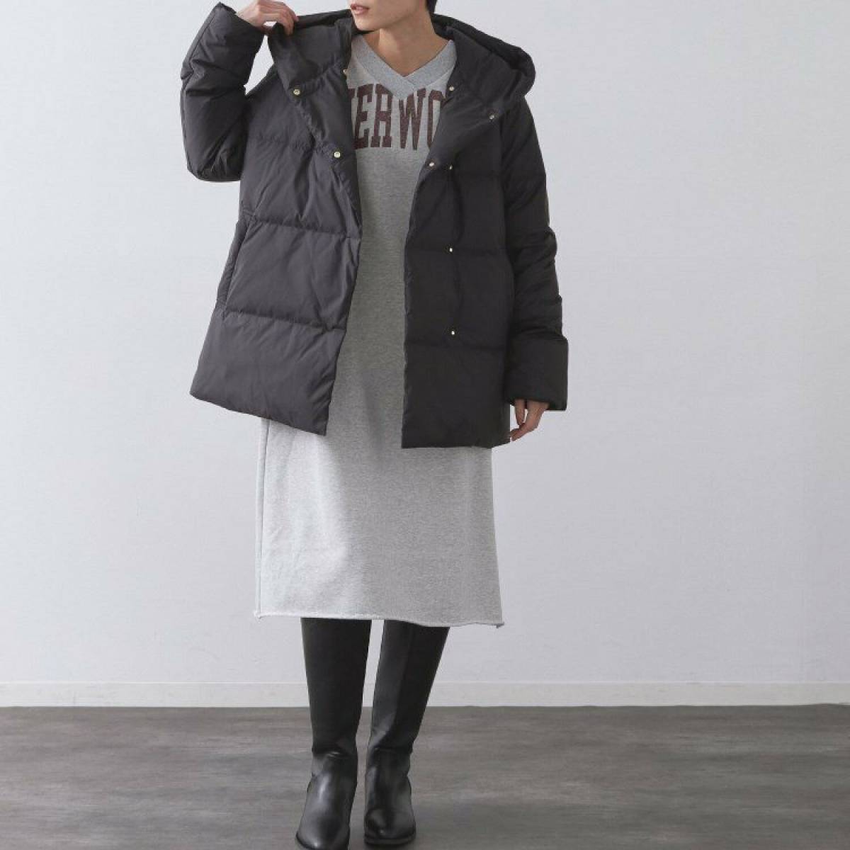 パンツにもスカートにもマッチするショート丈の黒ダウンコートは、1着持っておくと便利です。