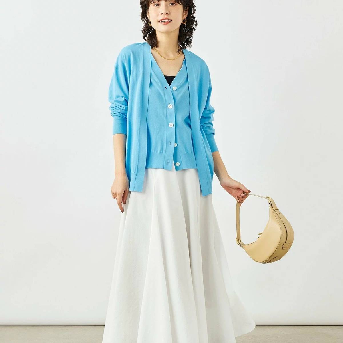 発色のいい水色カーディガンに、クリーンな白スカートが相性抜群!
