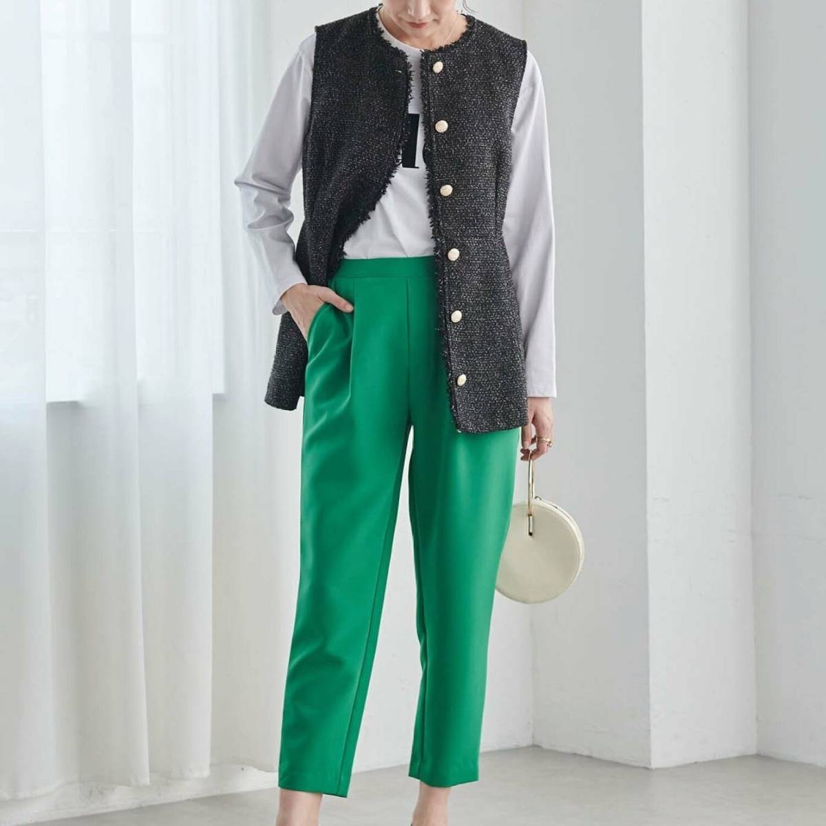 おしゃれアイテムのジレをプラスすれば、ワンランク上の緑パンツコーデが完成です。