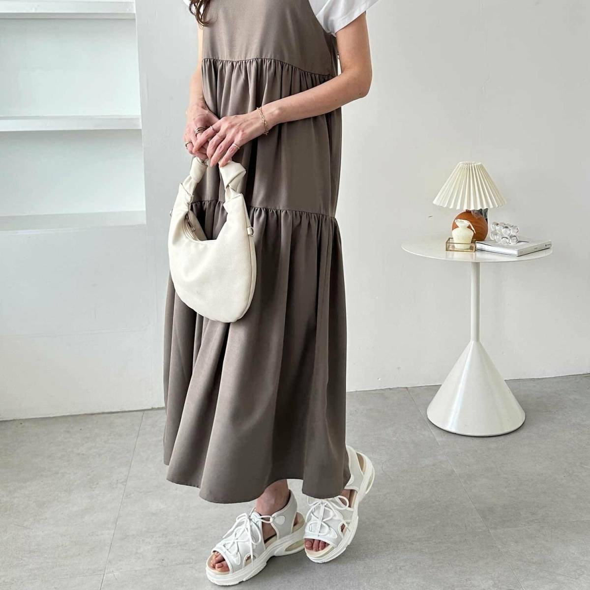 Tシャツ×キャミワンピースの大人可愛いコーデにスポーツサンダルを合わせると、今時の抜け感が演出できておしゃれ♡