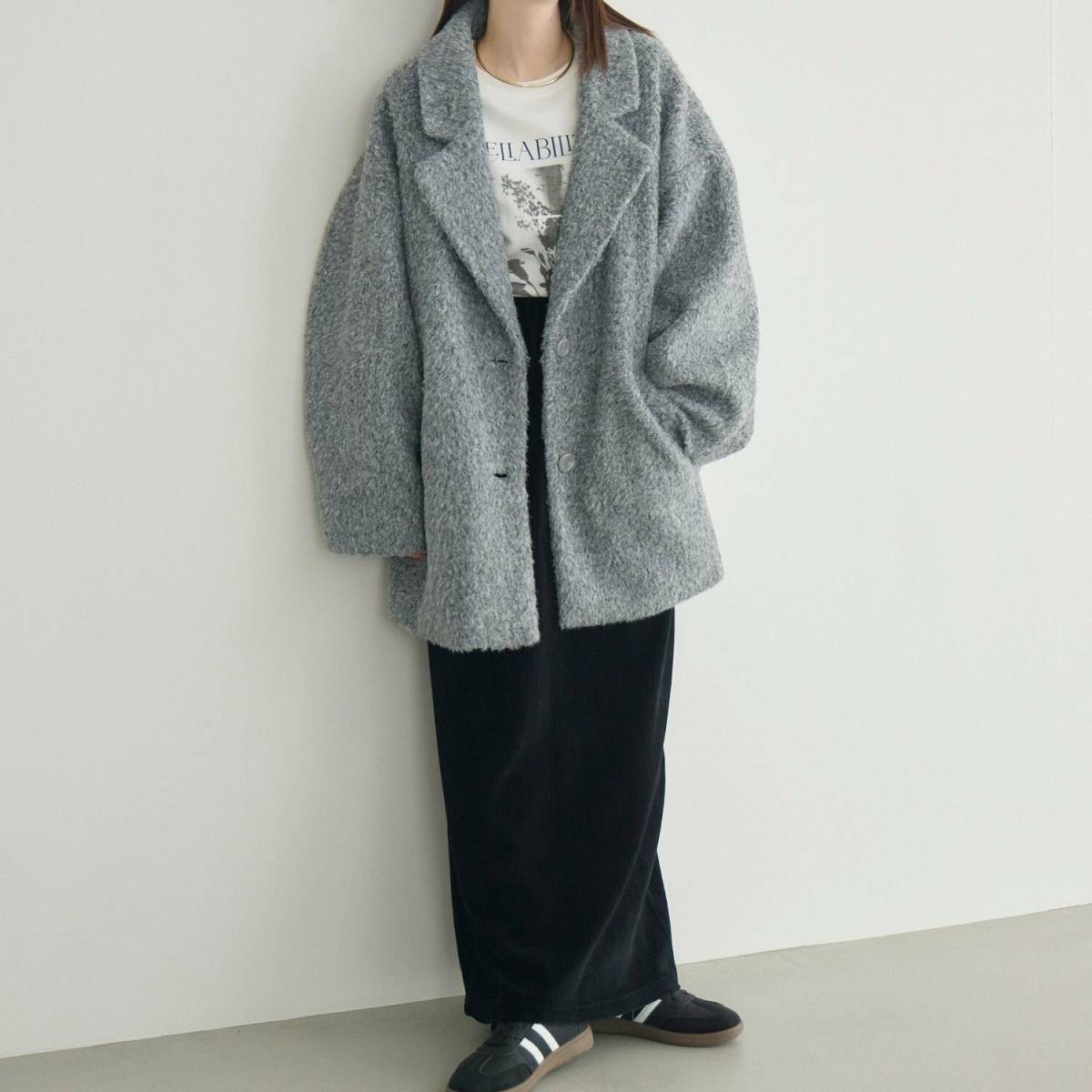 ショート丈のコートなら腰の位置が高く見え、自然とスタイルアップが叶いますよ。
