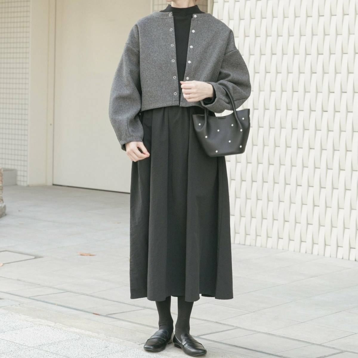 チャコールグレーのカーディガンと合わせたモノトーン配色なら、大人っぽい雰囲気に仕上がります!