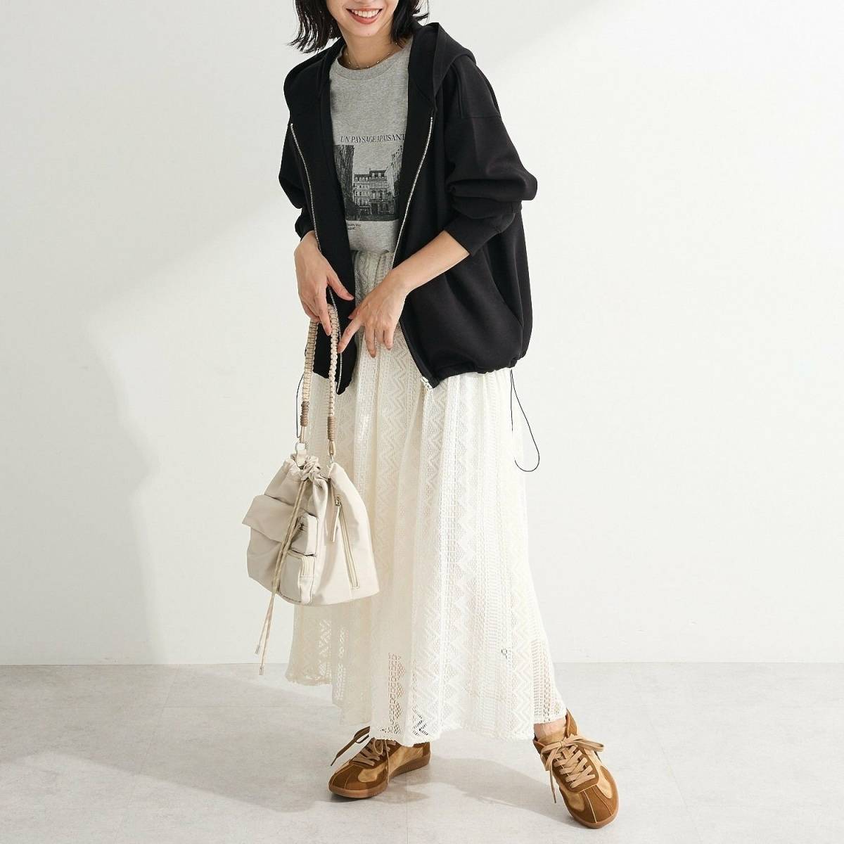 黒パーカー×レーススカート