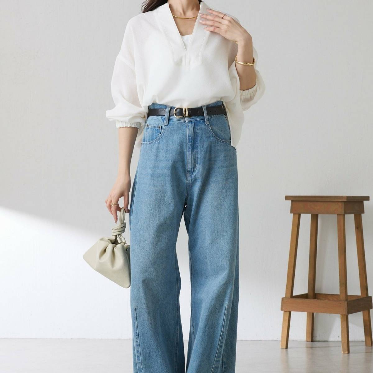 白ブラウス×淡色デニム