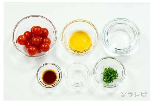 - 器に「2」のプチトマトと「3」をいれ、冷蔵庫で冷たくなるまで冷やし、大葉を飾る