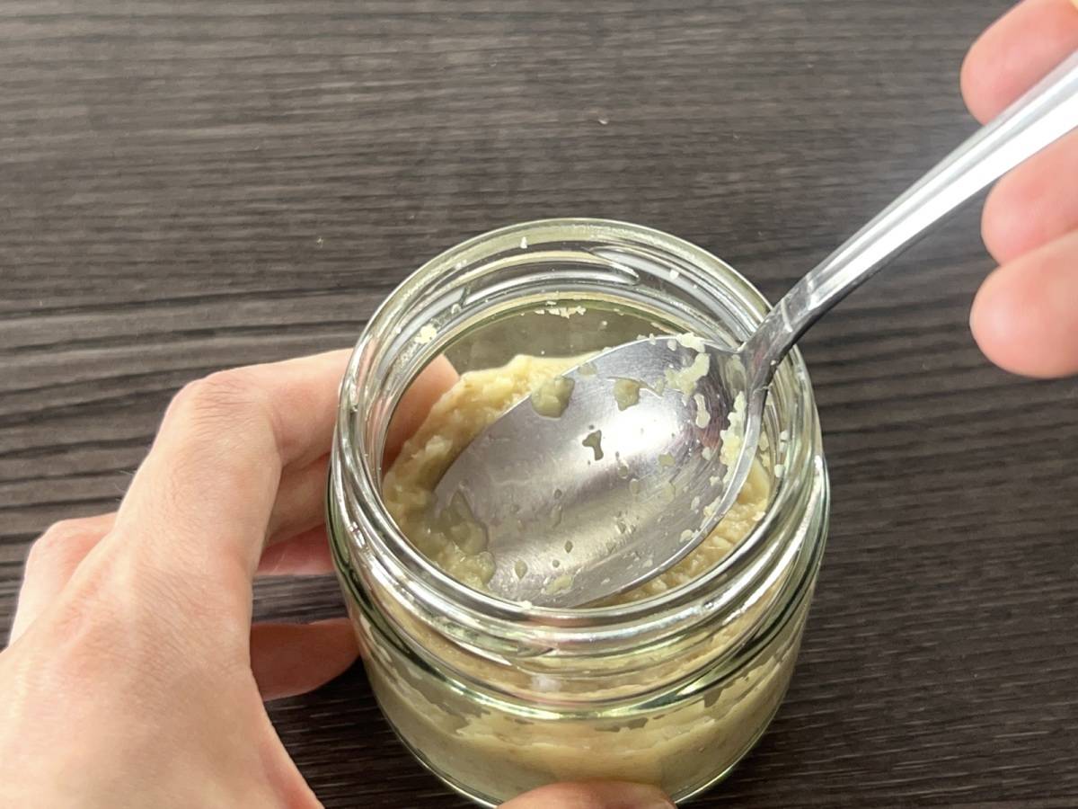 清潔な保存容器にすりおろした生姜を汁ごと入れ、空気が入らないよう押しながら詰めていきます。