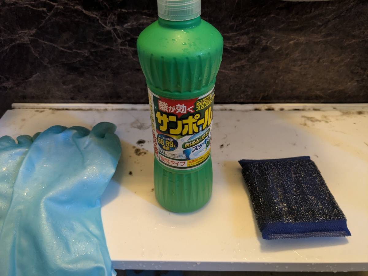サンポールは強い酸性なので、ゴム手袋と換気をしましょう!