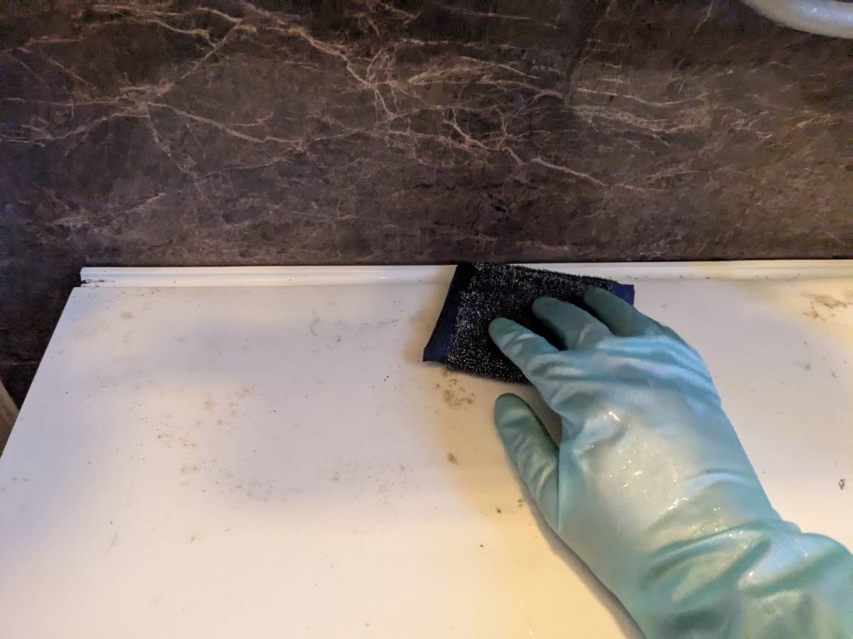 サンポールをスポンジにつけて、汚れている箇所を掃除していきます。