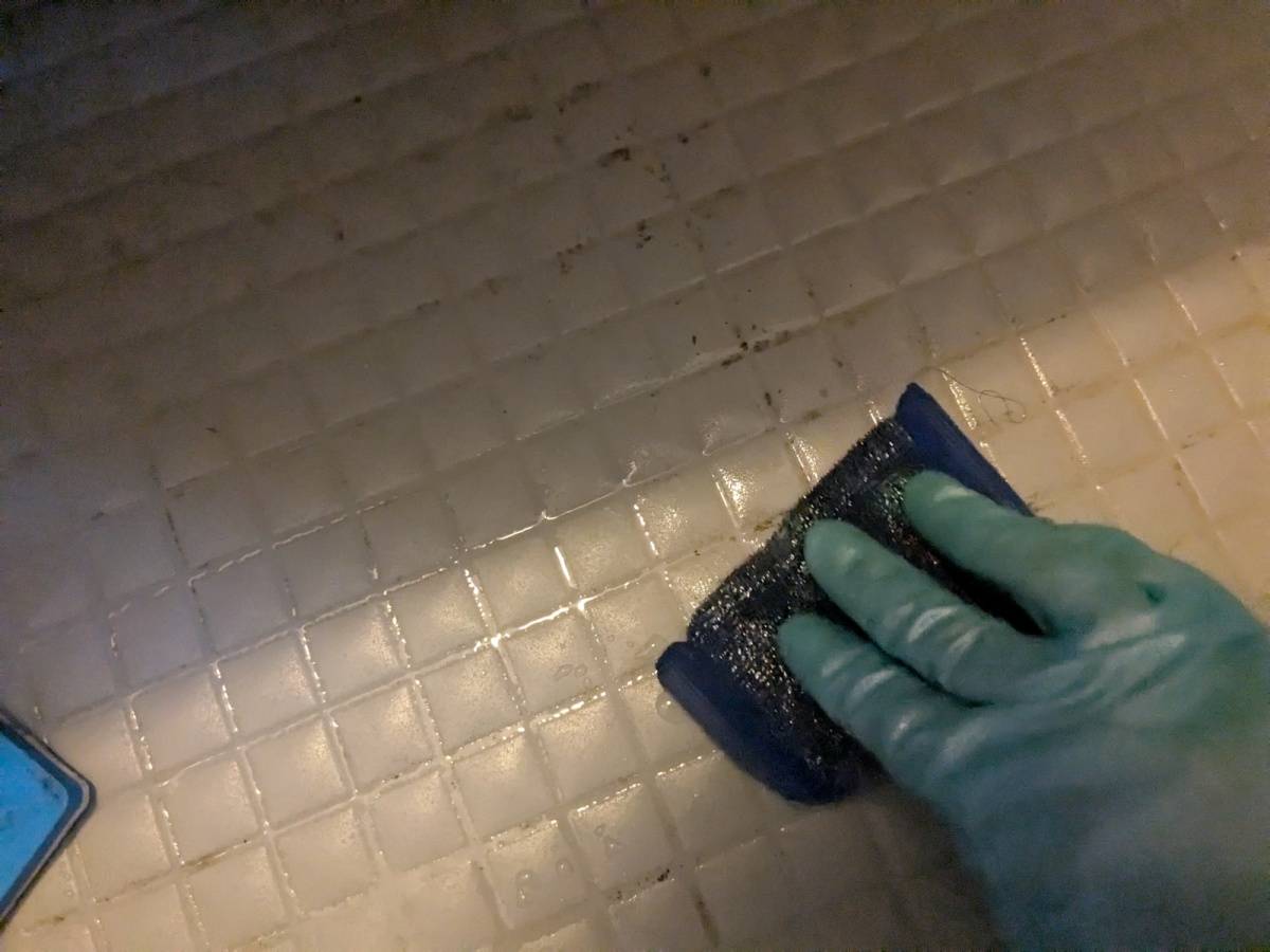 おそうじダイアリーの「【お家のお困り事】100均のスポンジで20年モノの【浴室の洗い場】周辺の汚れ落としに挑戦!」