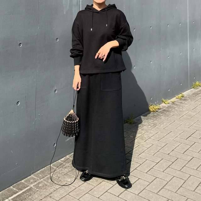 スカートは、パーカーのロゴと同色の黒を選ぶと統一感が出ます。