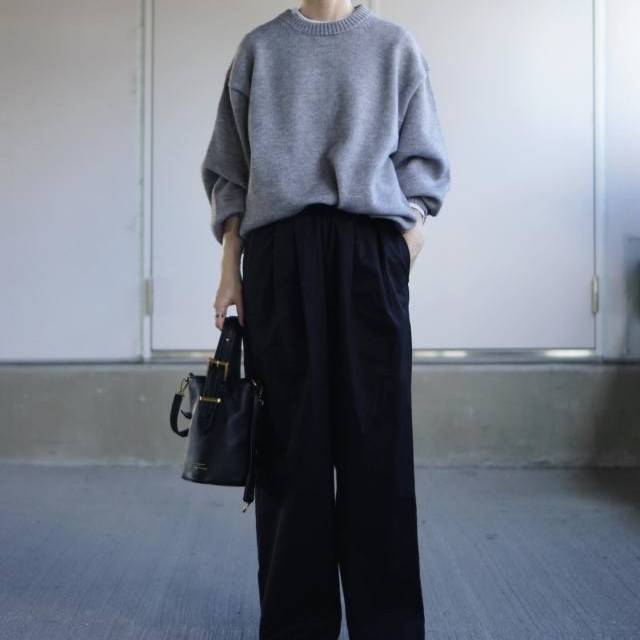 ゆるっと着られるサイズ感にセンスのよさを感じるグレーニットは、黒パンツを合わせて濃色コーデに仕上げるとセンス抜群!