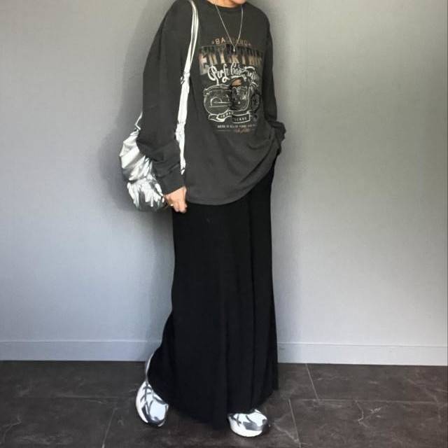 きれいめにもカジュアルにも着られる、ロング丈の黒スカート。