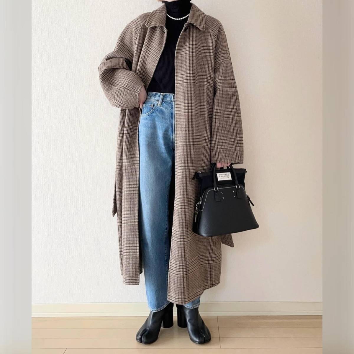 黒のハイネックニットとデニムパンツに黒のバッグ、ブーツを合わせれば、チェック柄コートの存在感が引き立ち、センスのよさをアピールできますよ♪
