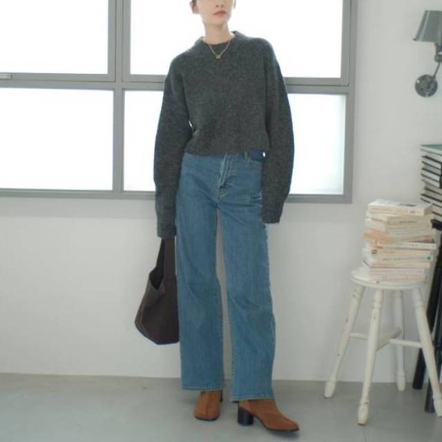 グレーのニットとデニムパンツのコーデはしっかり肌を覆えるのであたたかく、1月のおでかけにピッタリ!