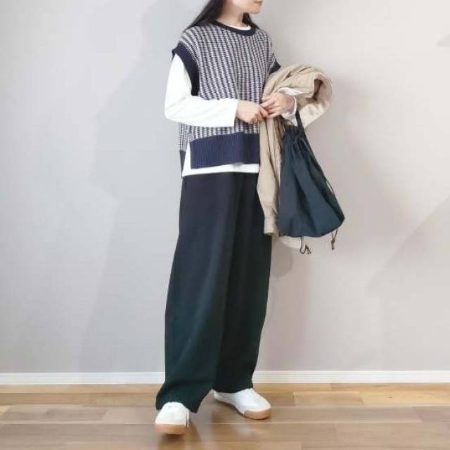 長袖の白トップスの上にストライプ柄のニットベストを重ね着すれば、大人カジュアルコーデのできあがり♪