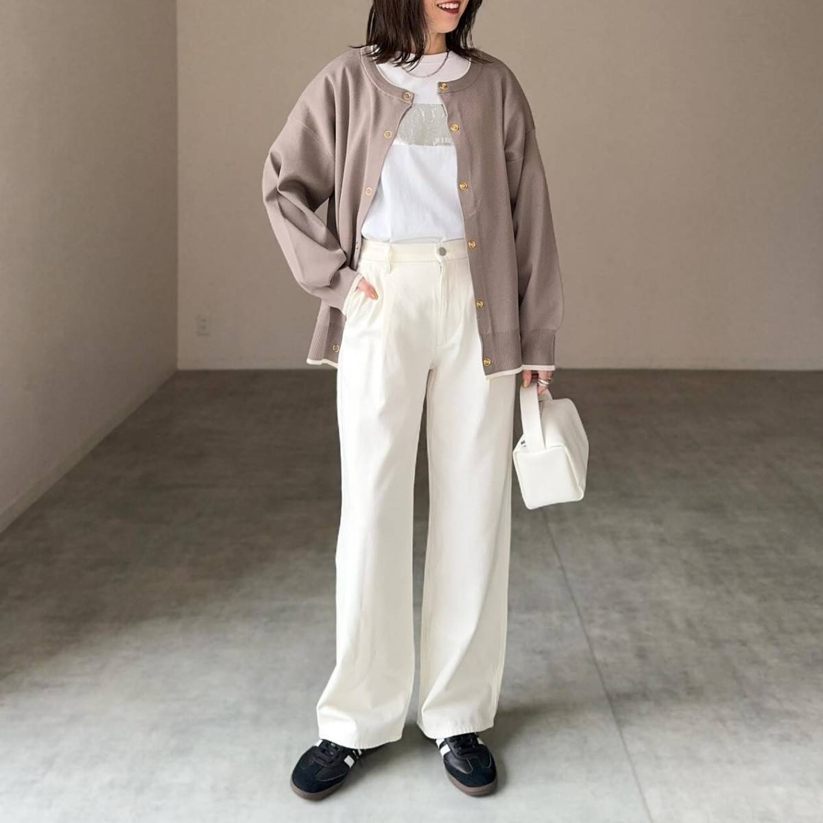 【2月編】50代向けカーディガンコーデ⑤ホワイトコーデ×モカカーディガン