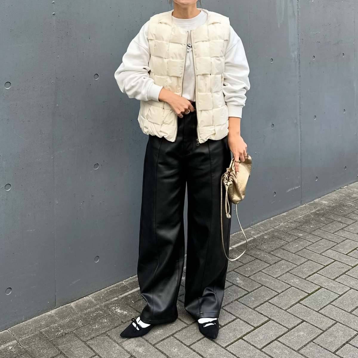 レザー素材が目を引く黒のワイドパンツは、2月のおでかけシーンで出番が増えるおしゃれアイテム。