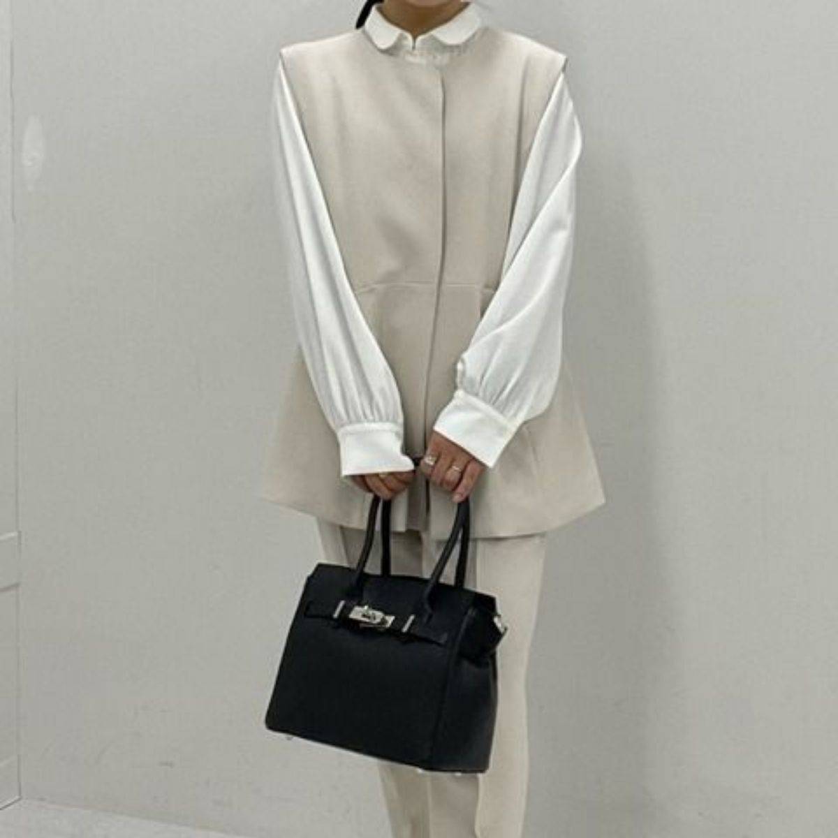 セレモニーにも通勤にも使える!きれいめセットアップ③ペプラムジレ+テーパードパンツ