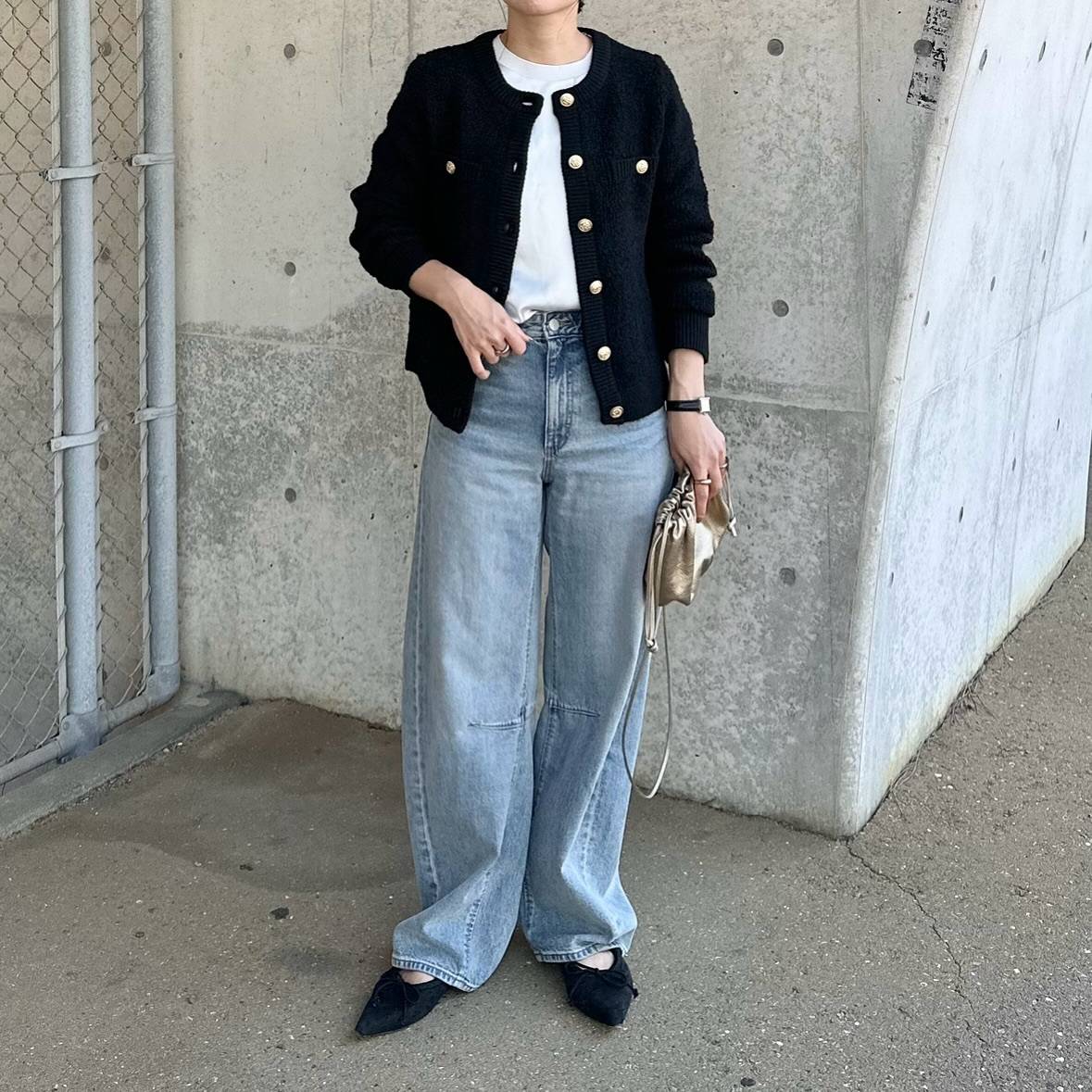 長袖トップスとデニムパンツの組み合わせは、毎年2月に着ている定番。