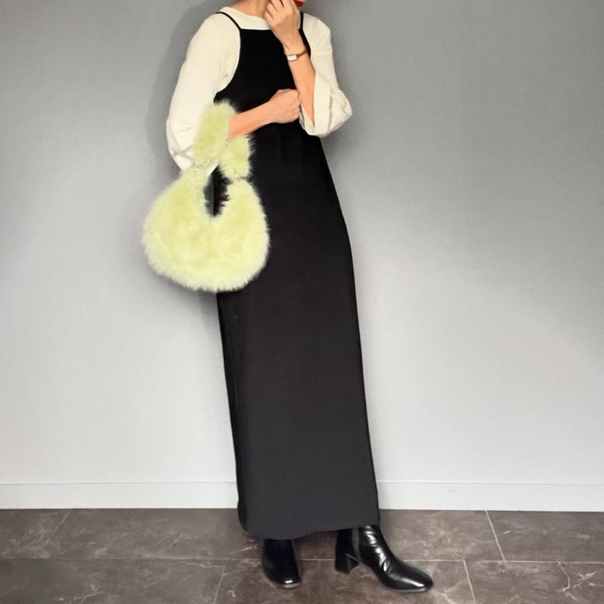 バッグやブーツなどの小物はワンピースと同じ黒を選ぶと◎