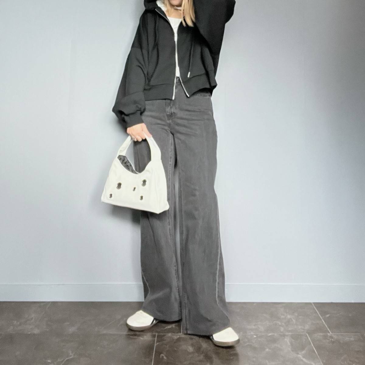 黒パーカーにグレーのデニムパンツを合わせたら、バッグや靴は白を選ぶと◎
