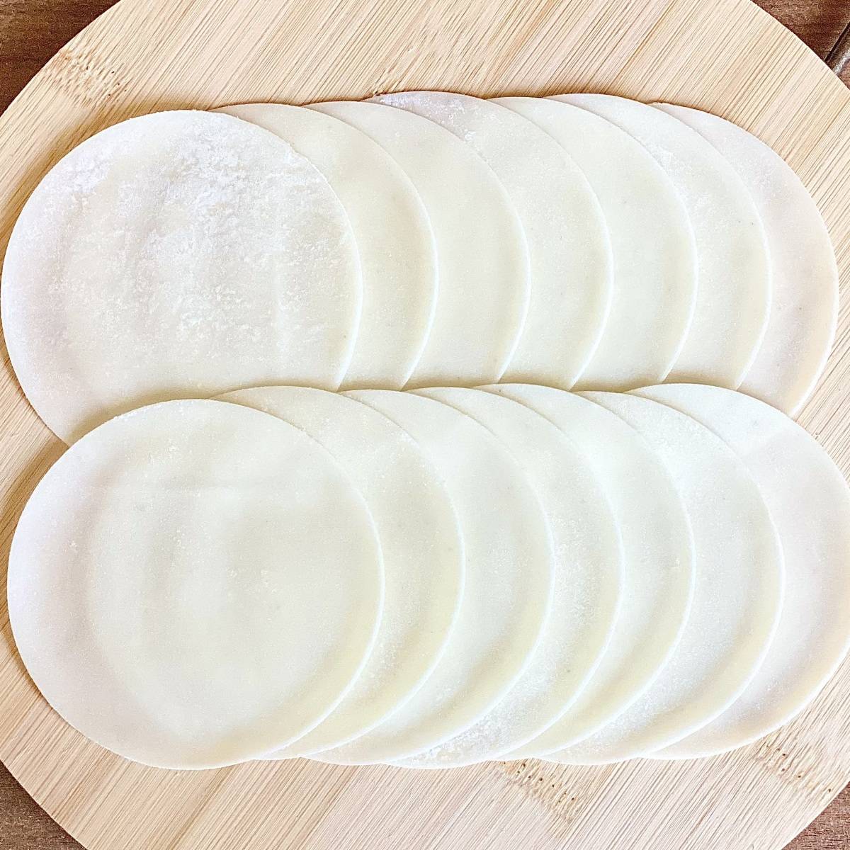 餃子の皮を3枚、重なる部分に水をつけてつなぎ合わせます。