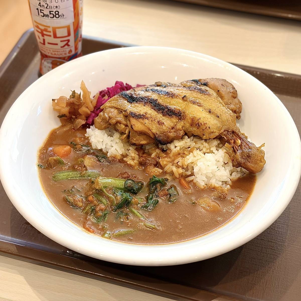 今回注文したのは、骨付きの大きな炭火焼チキン&ほうれん草をトッピングした大人気カレー。