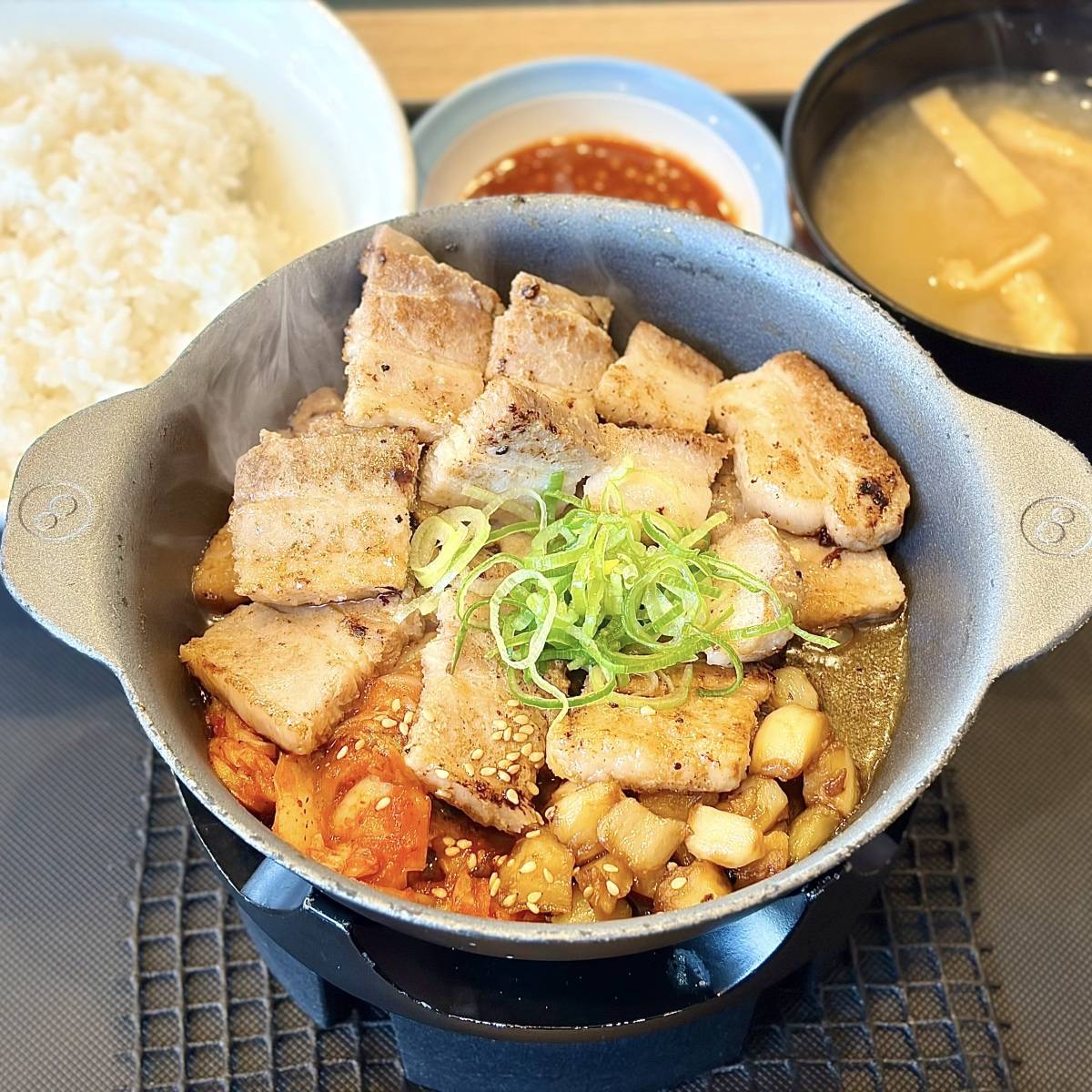アツアツの鉄鍋にごはんを投入し、韓国風の焼き飯(ポックンパ)にして食べるのもおすすめ。