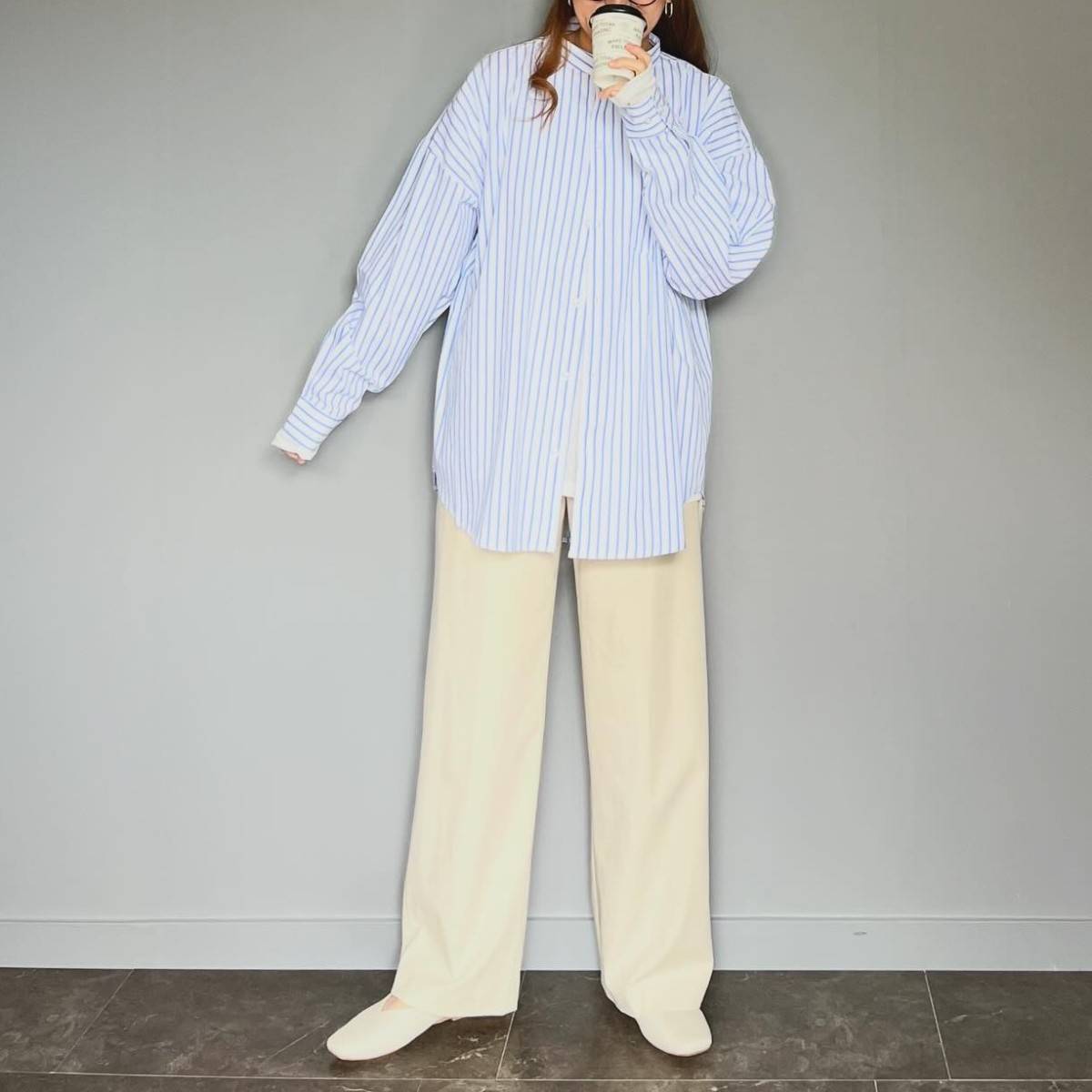 今すぐマネしてみてほしいのが、ブルーのストライプ柄のシャツに白のワイドパンツを合わせたコーデ♡
