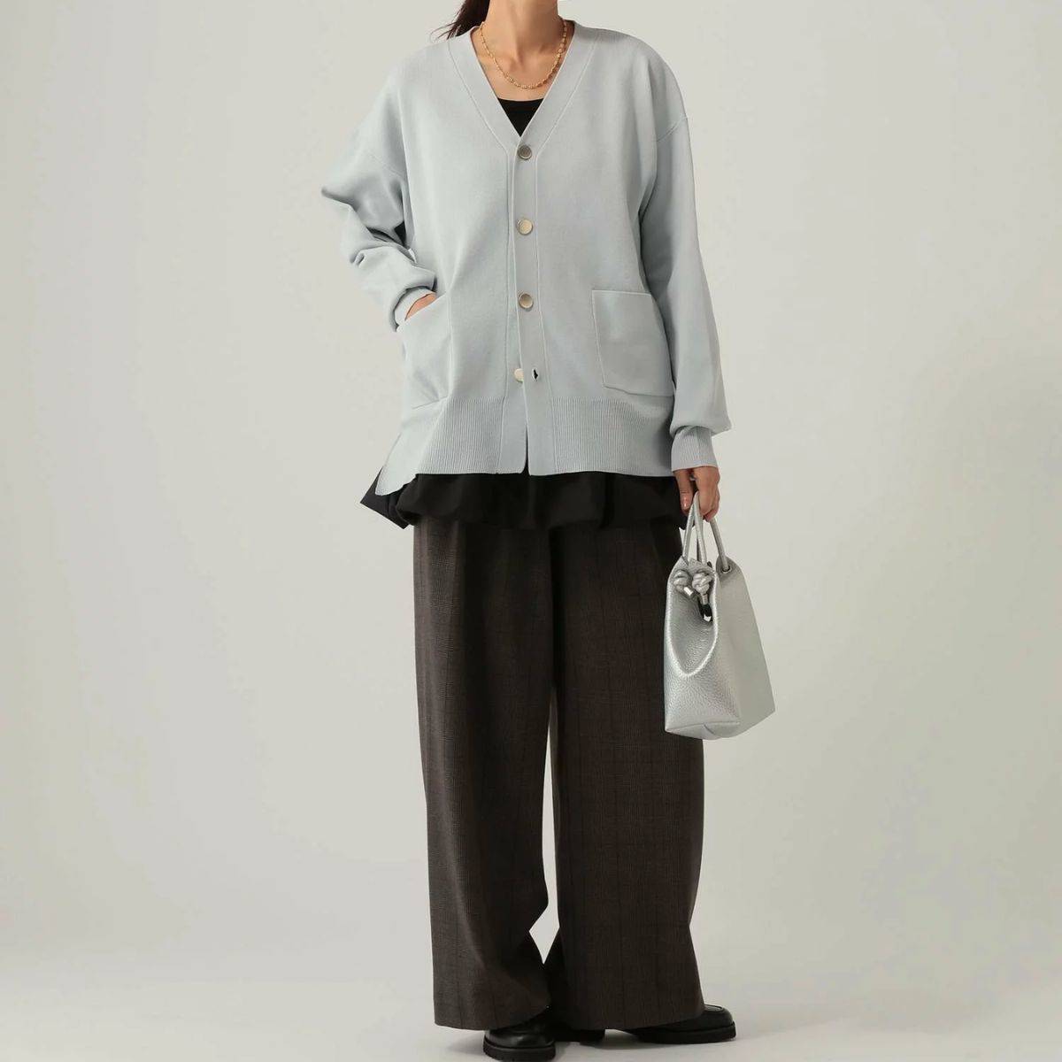 すっきりシルエットのカーディガンはどんな大人コーデでもしっくりくるので、一着持っておくと重宝しますよ。