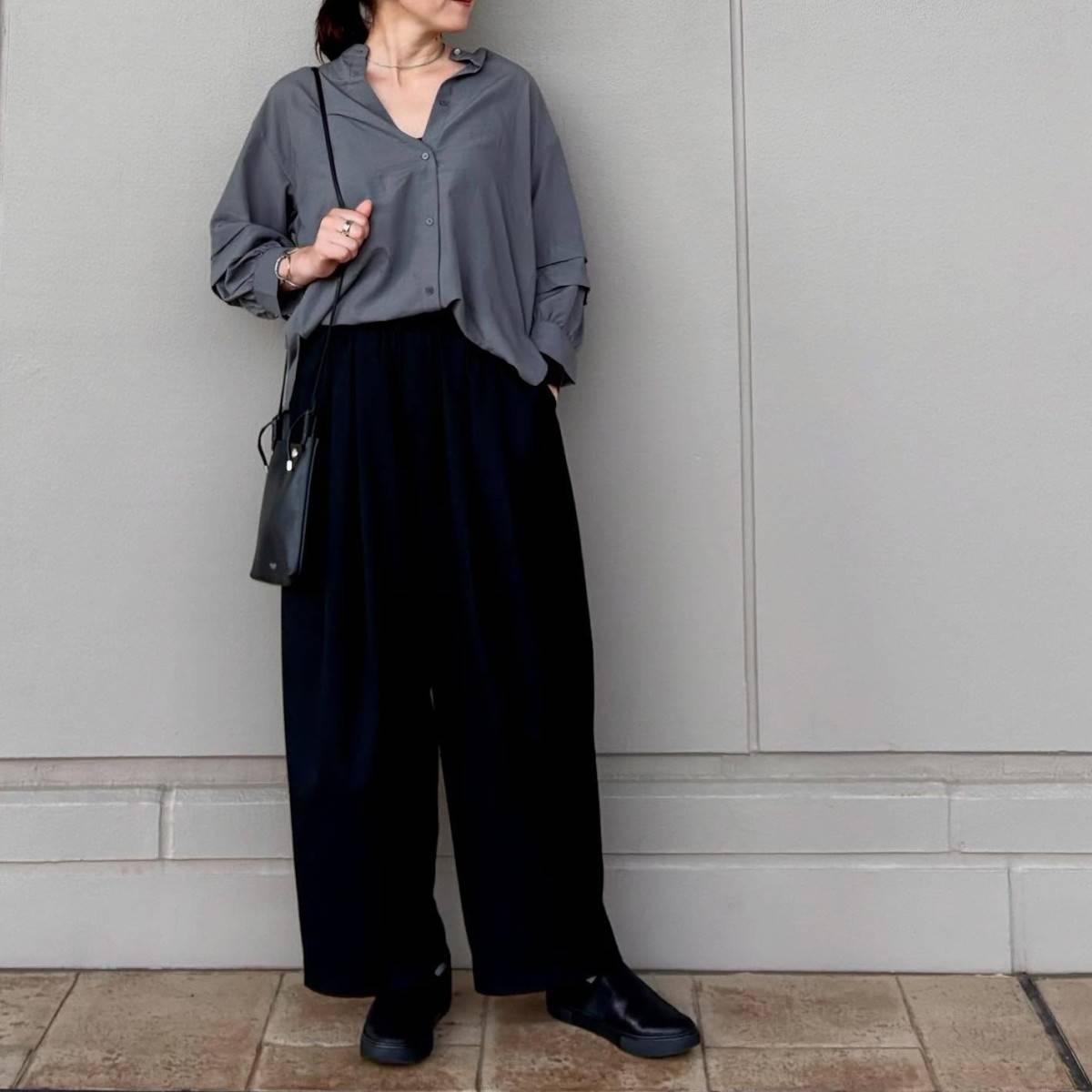 グレーのシャツと黒のワイドパンツの濃色コーデは大人っぽく着られるので、50代の女性にピッタリ!