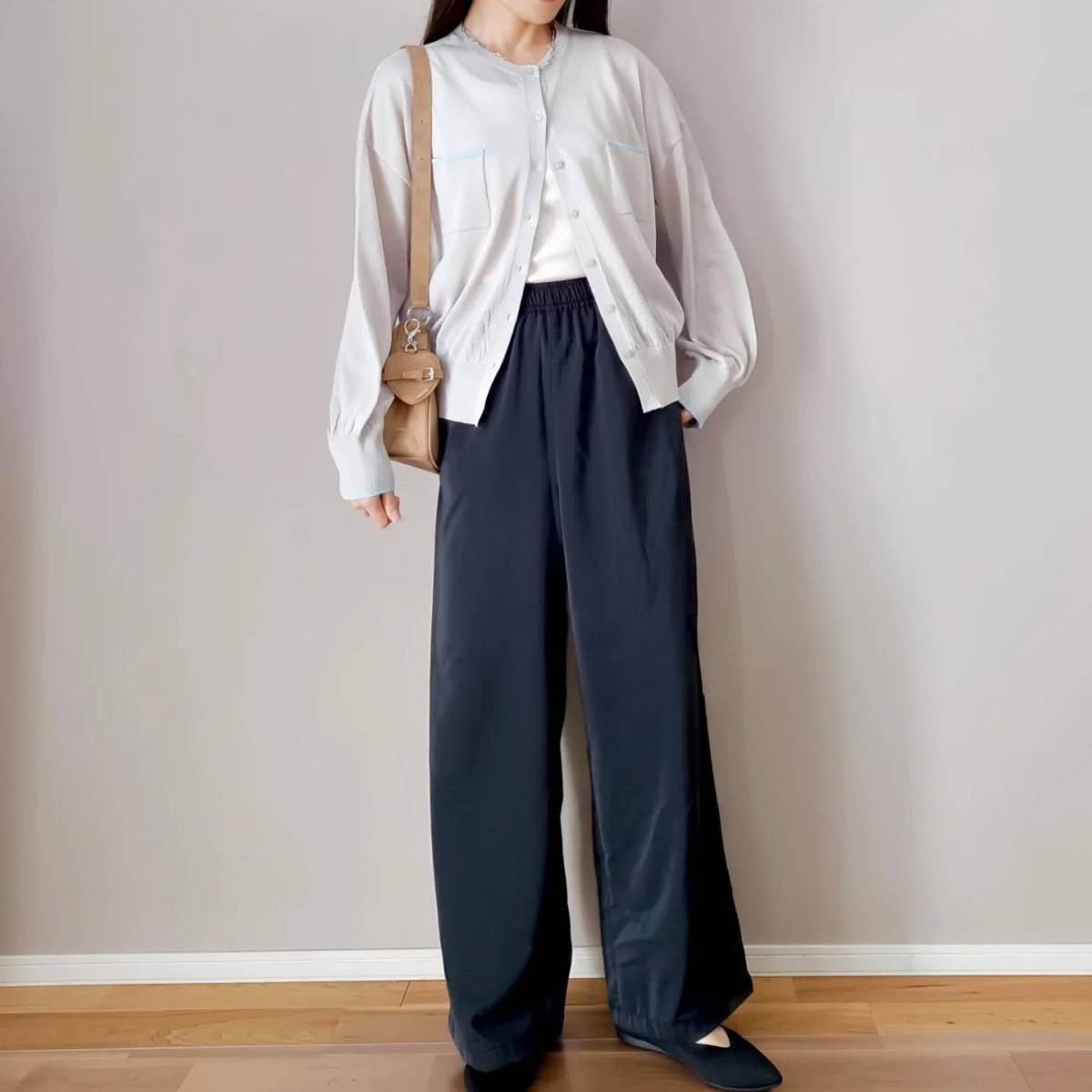 白トップスと黒パンツのモノトーンコーデに物足りなさを感じるときは、上からカーディガンを羽織ってみて♪