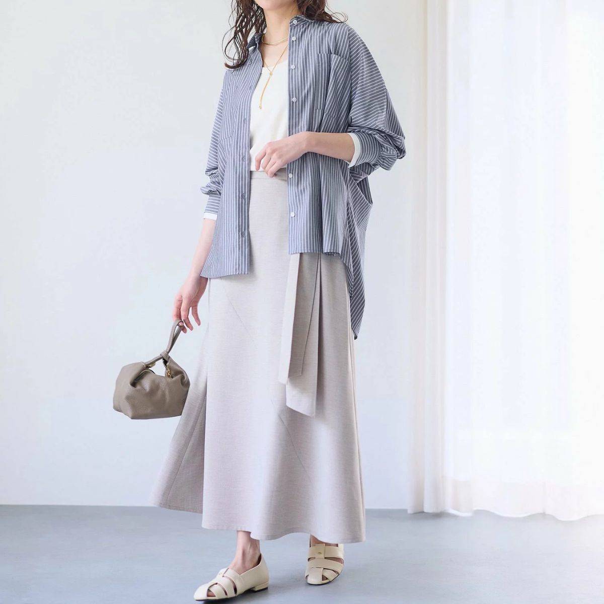 落ち感のある生地のシャツは、体のラインを拾わずスッキリ見えも叶えます。