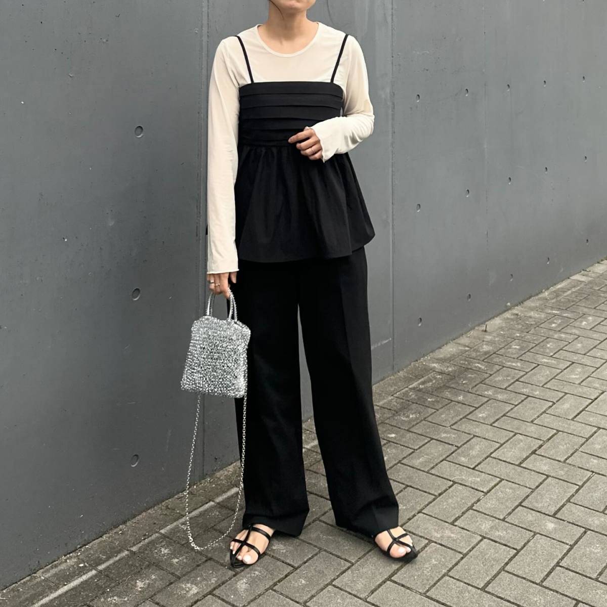 透け感が涼しげで4月にピッタリなシアートップスの上に、ペプラムデザインのキャミソールを重ね着すると◎