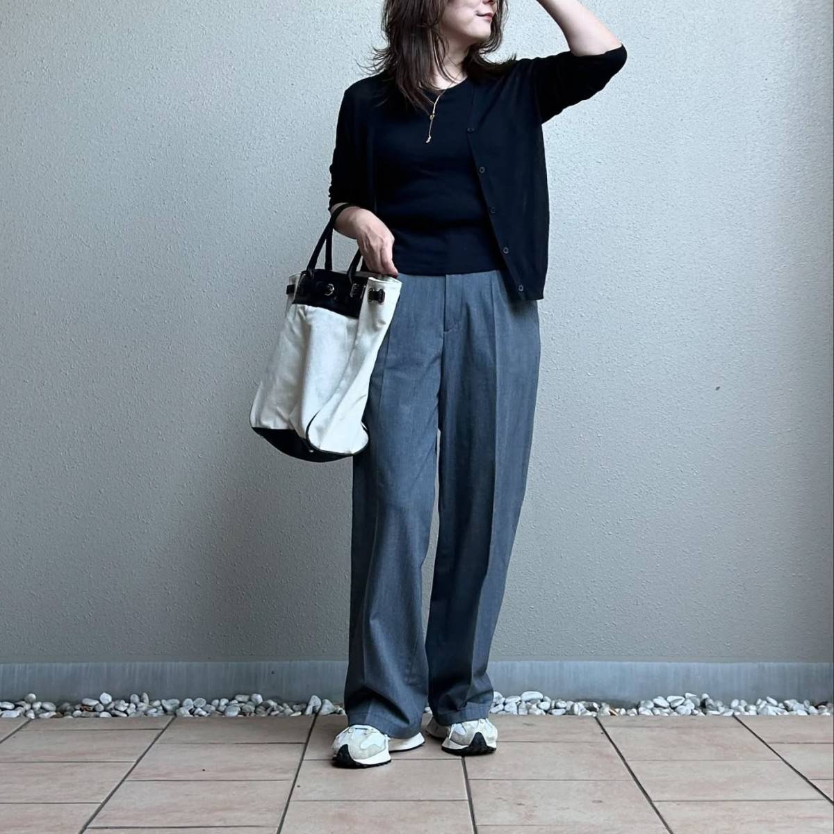 【4月編】垢抜ける60代向けカーディガンコーデ④モノトーンコーデ