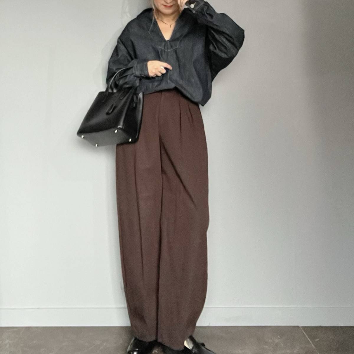 スキッパーデザインのおかげでデコルテがスッキリ見えるデニムシャツを着るなら、ワイドパンツが好相性♪