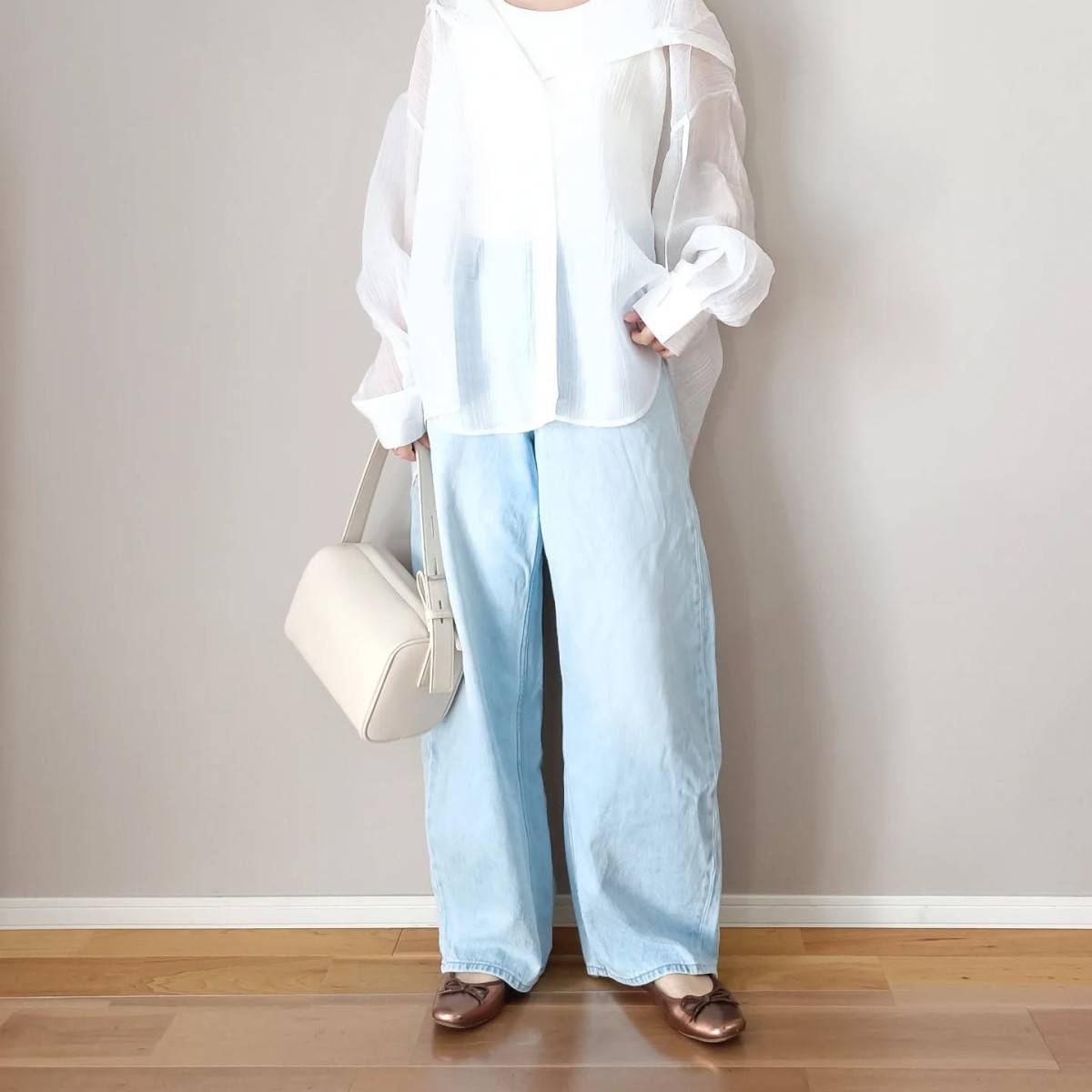 【4月編】老け見えしないデニムパンツコーデ⑤シアーシャツを合わせる!