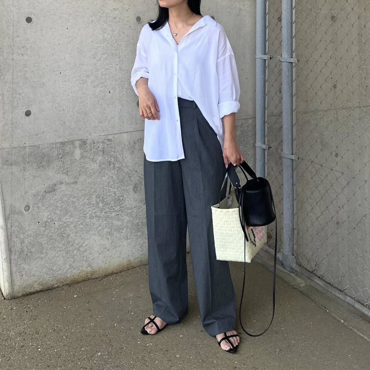 白シャツとグレーパンツは、オンオフ問わず着られる失敗知らずなコーデ♪