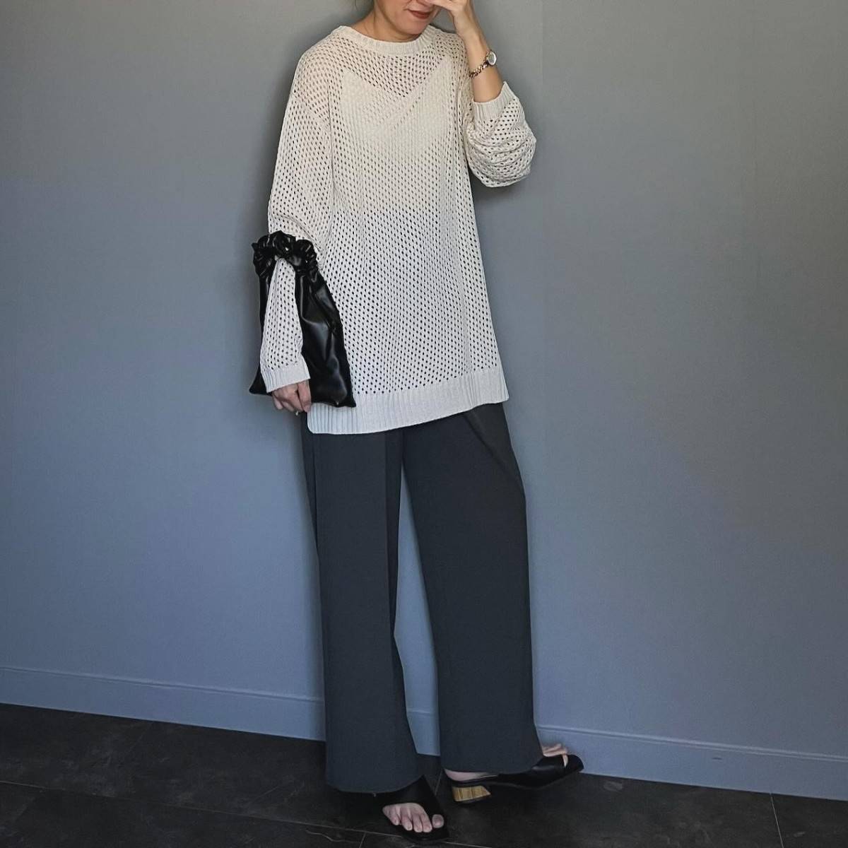 【4月編】太って見えないワイドパンツコーデ⑤ロング丈のメッシュ編みニットを合わせる!