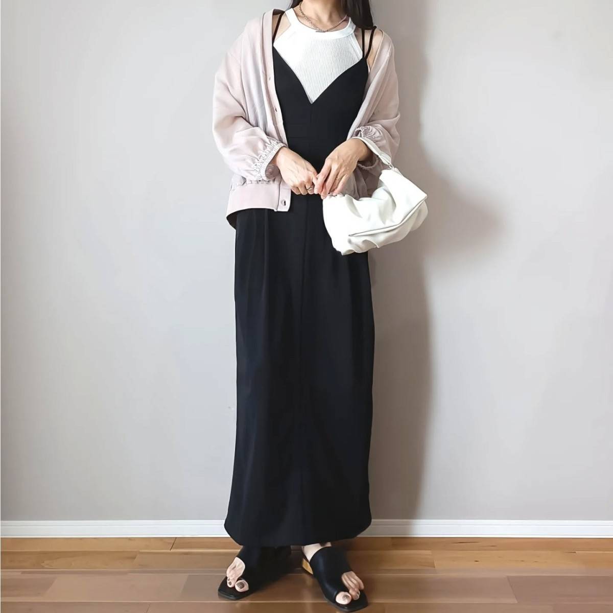 たくさん着まわせるキャミソールタイプの黒ワンピースは、もちろん4月も大活躍間違いなし♪