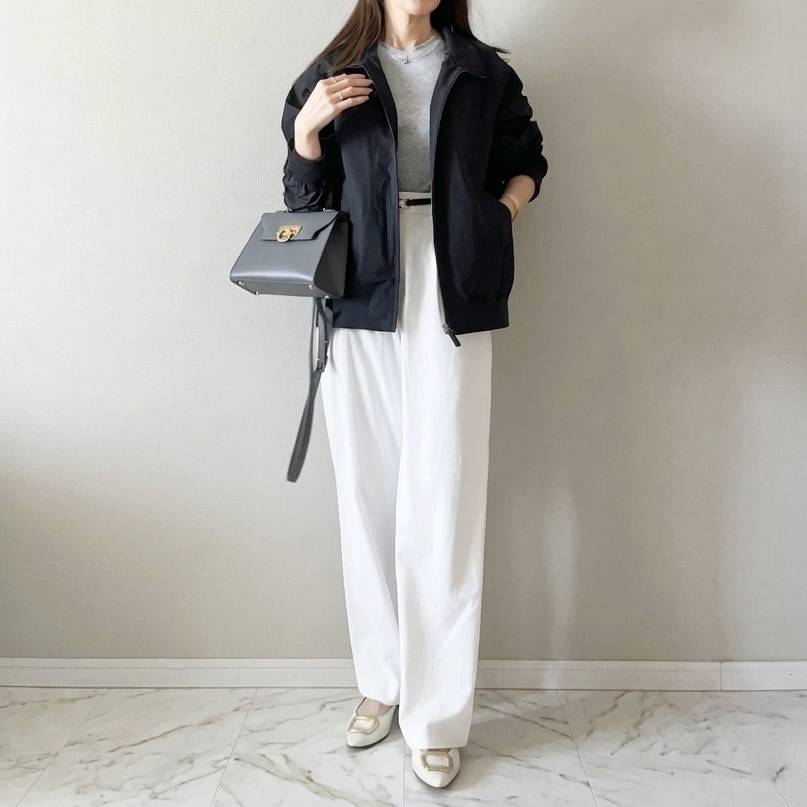 白のワイドパンツ×グレーのカットソーに、黒ジャケットを羽織ったモノトーンコーデ。