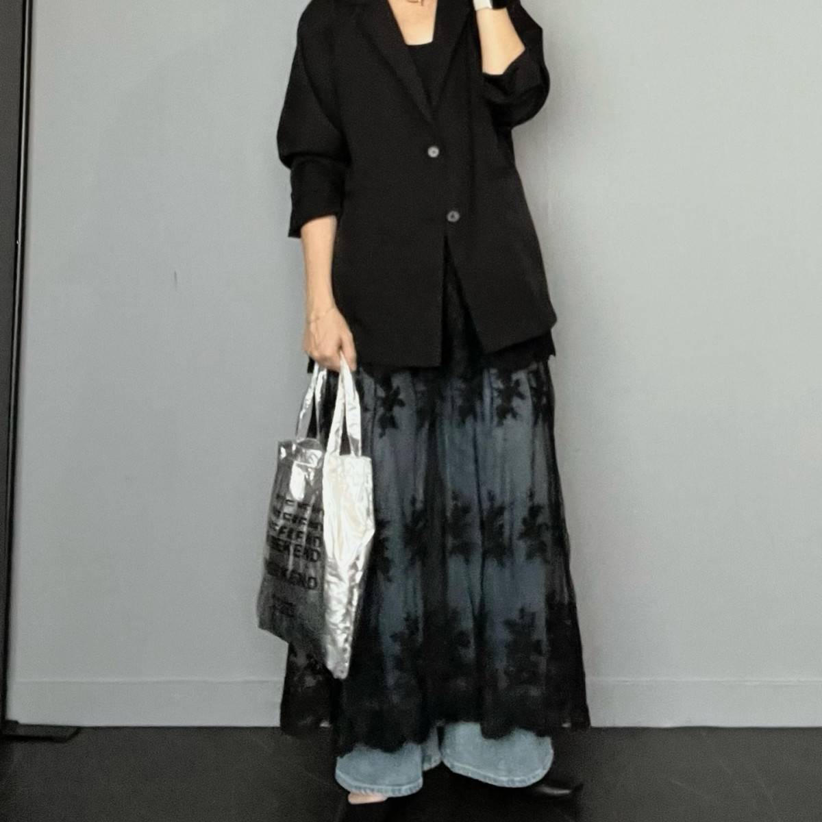 春らしさを感じるレース素材の黒スカートは透け感を生かして、ボトムスの重ね着にチャレンジしてみて!