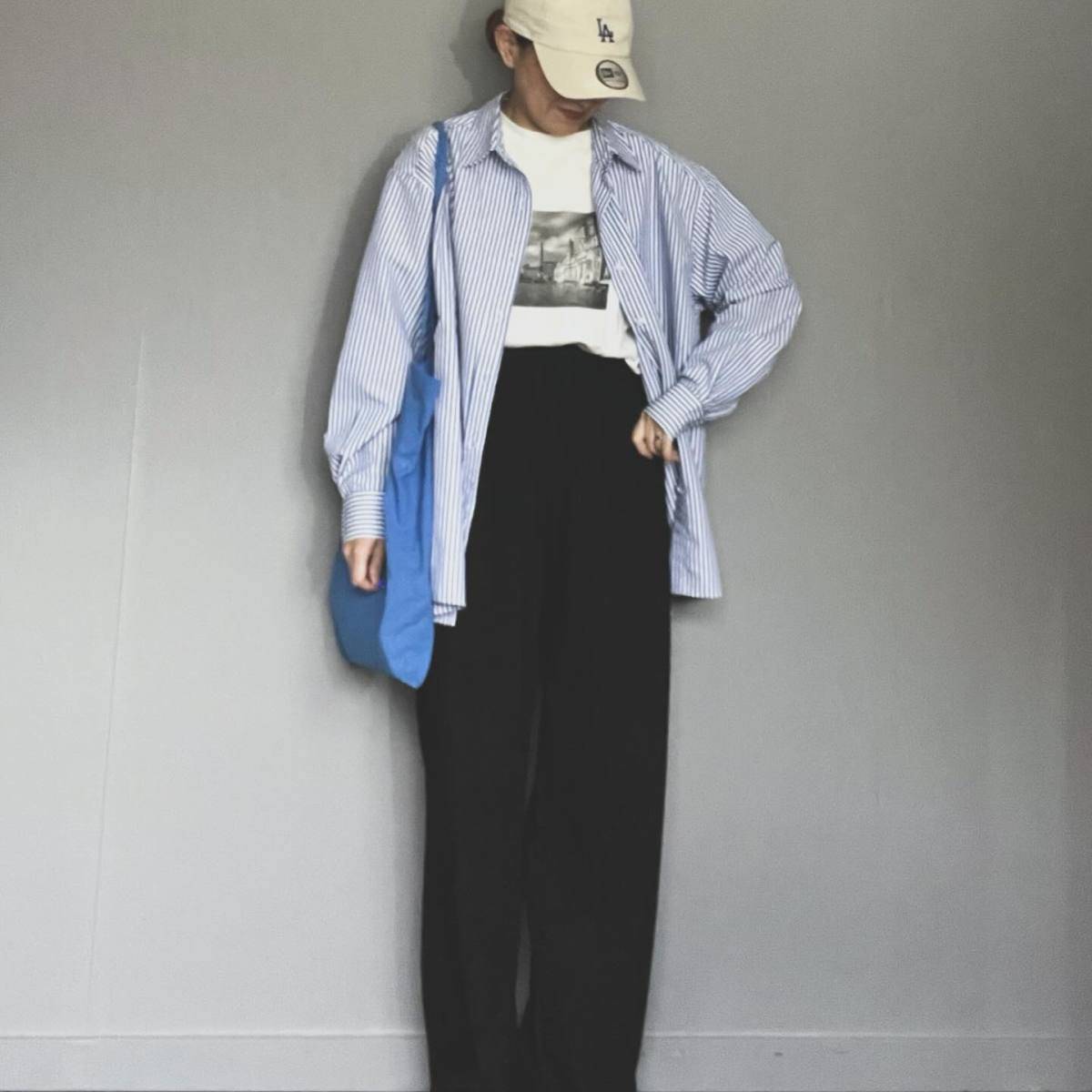 ストライプ柄のシャツを羽織ると、重心が上がってバランスよく見えるうえに、垢抜けますよ♡