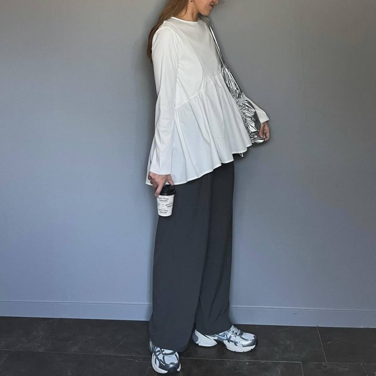 トップスはチュニック丈でペプラムデザインのものを、パンツはワイドシルエットを選ぶと、今っぽくてセンス抜群♡